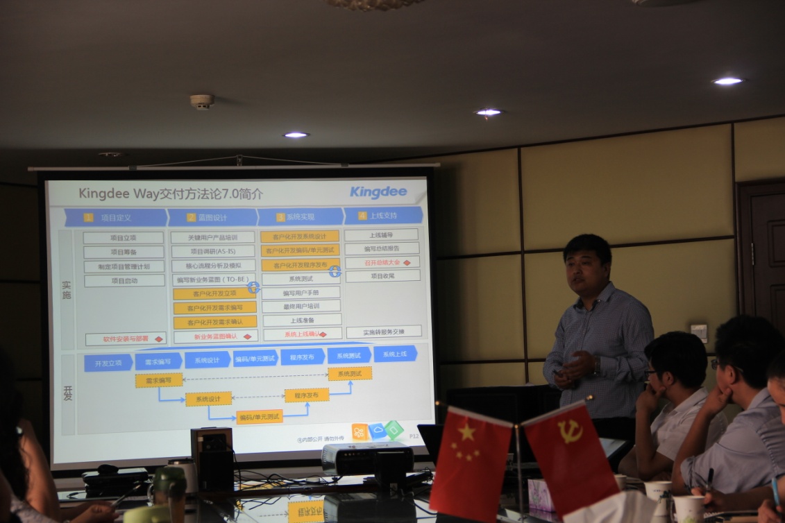 通過會議溝通,雙方共同確立了實施的相關(guān)事項、確定了各項目小組成員,金蝶方項目總監(jiān)做了“項目實施方案”和“金蝶實施方法論”的主題講解。