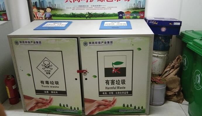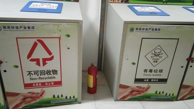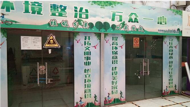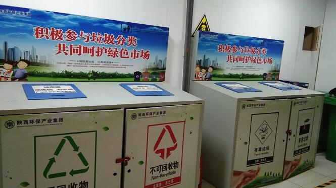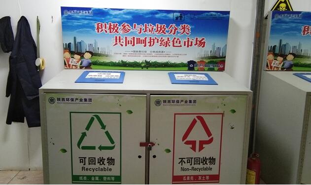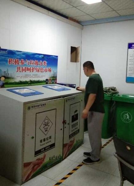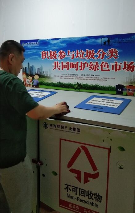 大觀園彩印市場(chǎng)的固廢間在市場(chǎng)中排的中段,占地面積約40m2。門(mén)頭配有綠葉圖案,預(yù)示著環(huán)保。室內(nèi)燈明幾凈,貼有不同標(biāo)識(shí)的垃圾桶一字排開(kāi),擺放有序。