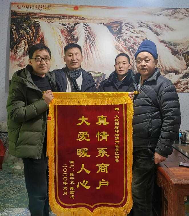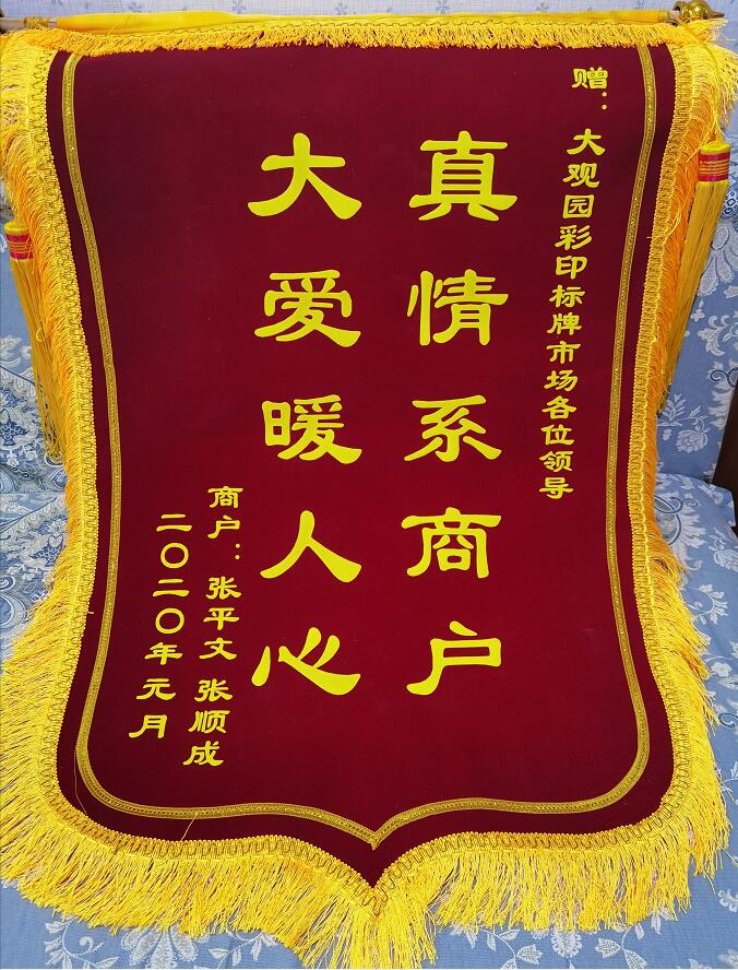 一面錦旗就是一面鏡子,它無時無刻不在激勵鞭策著市場辦的工作人員,“以商戶為本、為商戶解困”是市場辦工作的宗旨和原則,錦旗雖輕,情意濃濃,既蘊藏著商戶們對大觀園市場的感激與信任,更是對樂于奉獻品德的肯定。