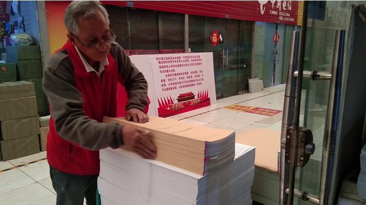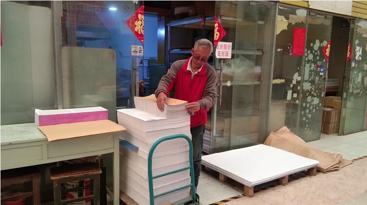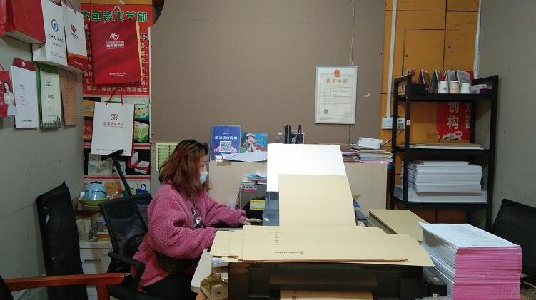 中排的辦公室由女老板李文秀負(fù)責(zé),接待、設(shè)計(jì)、洽談業(yè)務(wù);南排的加工車間由男老板陳先生負(fù)責(zé),車間外整齊地?cái)[放著各種原材料,里間擺放著嶄新的印刷設(shè)備,印刷半成品、成品依舊是擺放的井然有序,滿而不亂,堪稱南排商戶中室內(nèi)衛(wèi)生標(biāo)兵的榜樣。