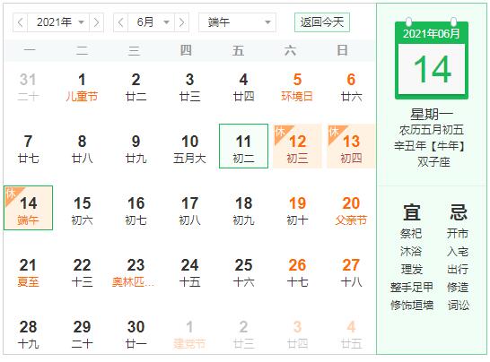 根據(jù)國務(wù)院辦公廳通知精神,現(xiàn)將2021年端午節(jié)放假安排通知如下:6月12日(星期六)至14日(星期一)放假,共3天,不調(diào)休。
