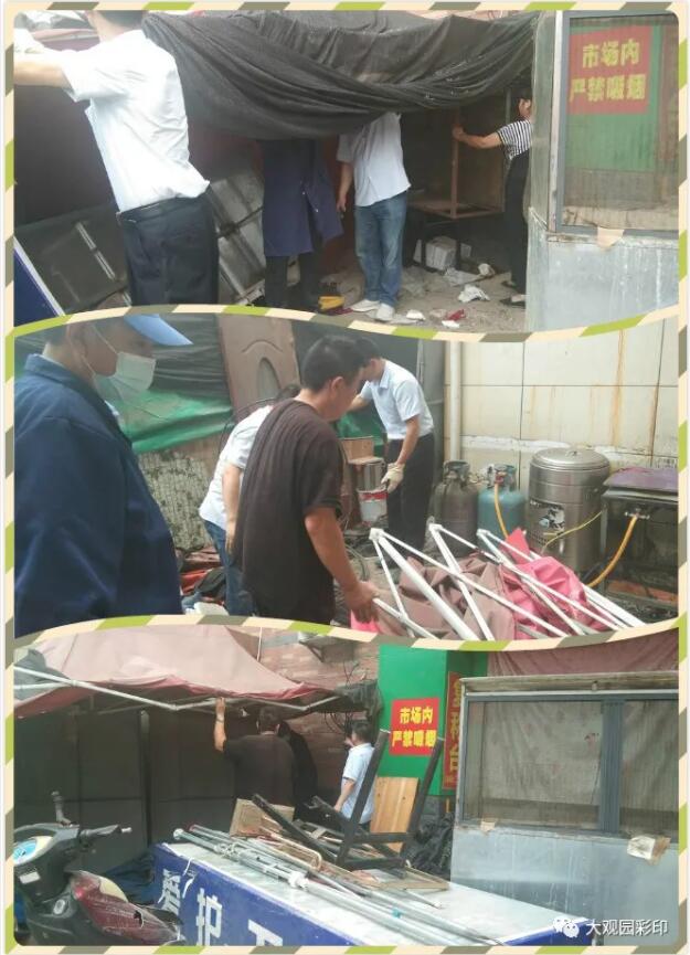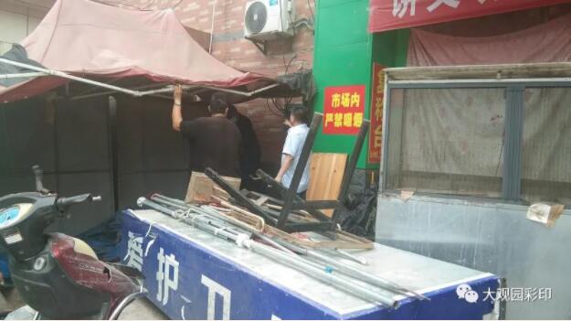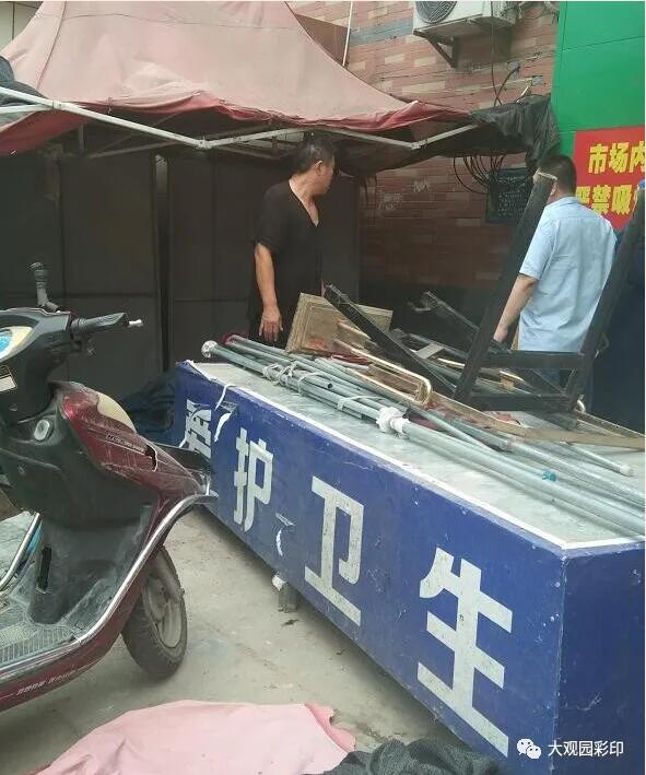 6.24日上午,接到街辦的環(huán)境整改通知后,大觀園市場(chǎng)辦立即行動(dòng)。西安大觀園彩印標(biāo)牌市場(chǎng),西安印刷廠,西安印刷包裝,西安廣告公司下午在市場(chǎng)查主管的帶領(lǐng)下,物業(yè)辦的李師傅、楊師傅積極配合下冒著酷暑拆除了市場(chǎng)西大廳外的亂搭亂建帳篷。