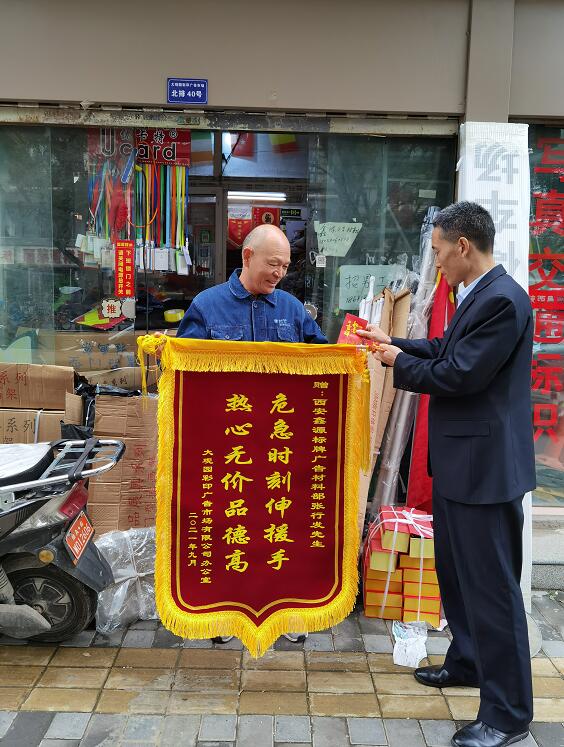 “危難時(shí)刻伸援手,熱心無(wú)價(jià)品德高”這面落款為2021年9月的錦旗,連同一個(gè)大大的紅包,在國(guó)慶佳節(jié)上班的第一天由市場(chǎng)辦查主任及孫師和李師共同護(hù)送到西安鑫源標(biāo)牌廣告、西安泰港印務(wù)兩家優(yōu)秀商戶手中 ,當(dāng)中究竟發(fā)生了什么,錦旗又隱含何種情意......