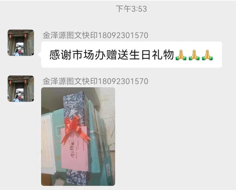 前兩天也是董老板的生日,市場辦早早就準(zhǔn)備好了生日的禮物,當(dāng)董老板接過生日祝福的禮物時(shí),激動(dòng)的連連對(duì)工作人員說,“謝謝,謝謝,感謝市場贈(zèng)送生日禮物,讓我收獲一個(gè)有意義又特別的生日,太感謝市場的精心付出了,我們一定會(huì)好好配合市場工作,讓大觀園彩印市場在大家的相互理解和支持下發(fā)展的更加美好?!?